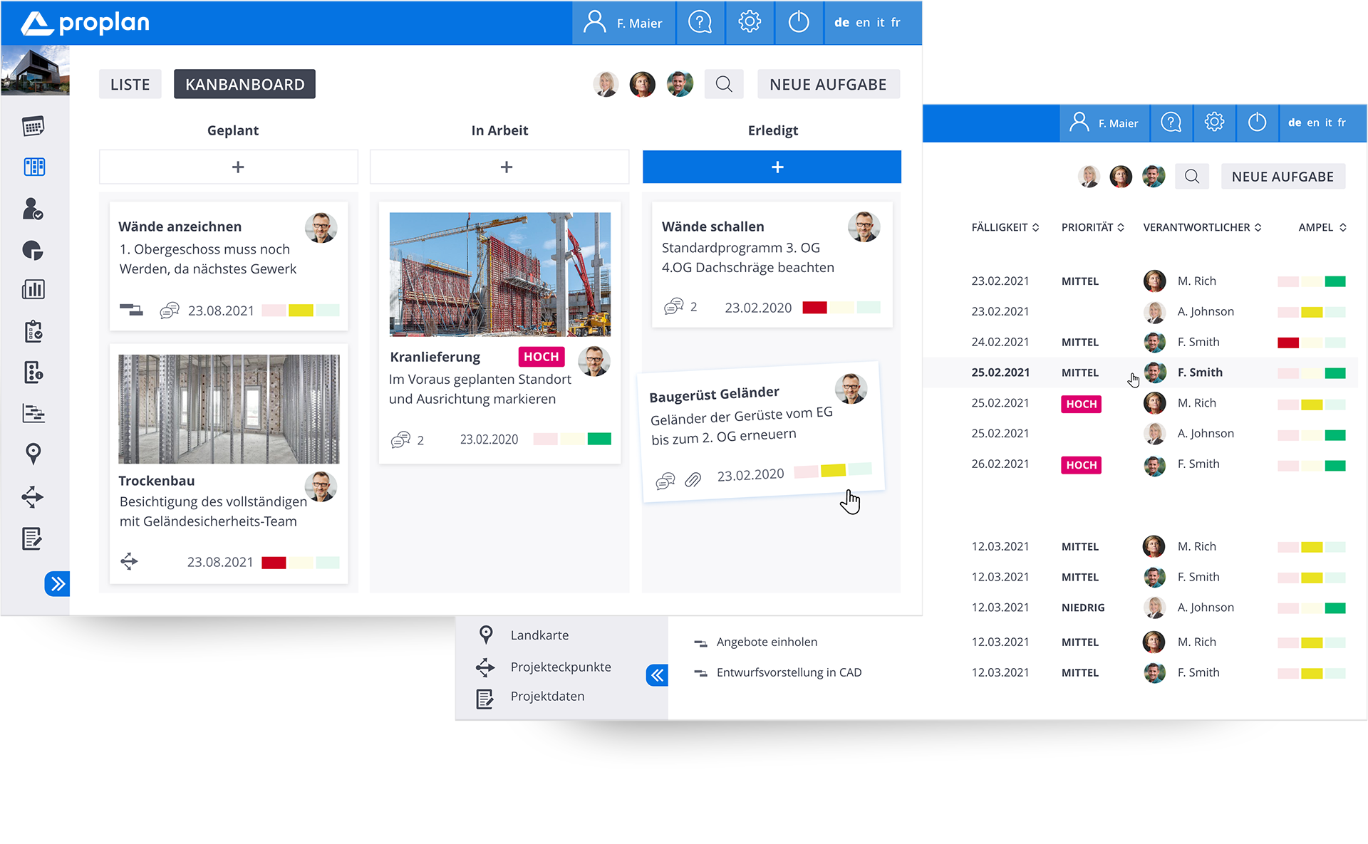 Komplexe Projekte erfordern einfache Tools. PROPLAN ermöglicht nicht nur die gleichzeitige Steuerung von mehreren Projekten, sondern jetzt auch die effiziente Umsetzung von projektbezogenen Aufgaben. Mit dem PROPLAN Tool zum operativen Aufgabenmanagement können Projektteams in Echtzeit den Status aktueller Aufgaben einsehen und koordinieren. So weiß jeder im Team, wer, was, bis wann erledigt. Teilen Sie Feedback, Dateien und Statusaktualisierungen. Der Newsfeed für Projektneuigkeiten erhöht zusätzlich die Transparenz und fördert Kollaboration – so macht die Zusammenarbeit im Projektteam Spaß!