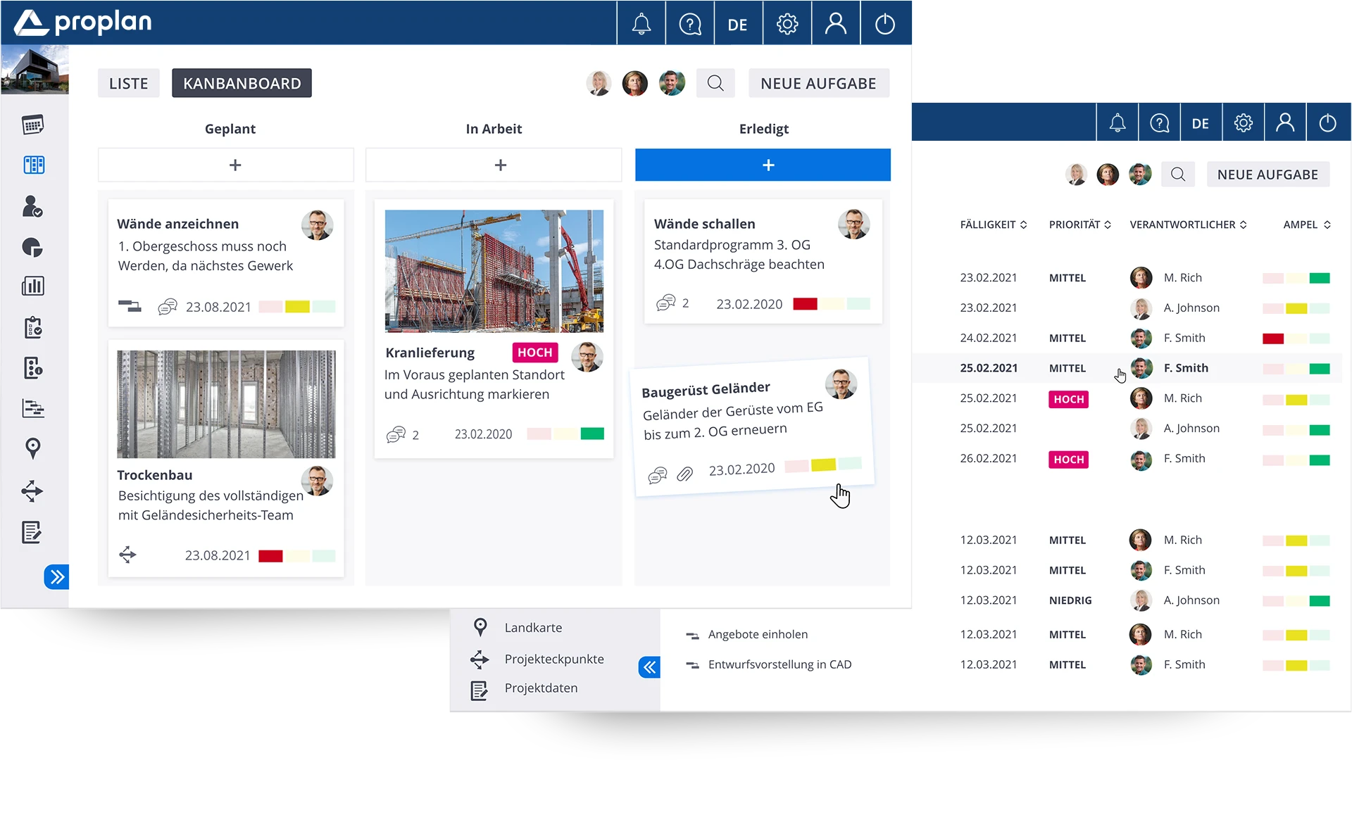 Complex projects require simple tools. PROPLAN not only allows the simultaneous management of multiple projects but also enables the efficient execution of project-related tasks. With the PROPLAN operational task management tool, project teams can view and coordinate the status of current tasks in real-time. This way, everyone on the team knows who is responsible for what and by when. Share feedback, files, and status updates. The project news feed further increases transparency and promotes collaboration – making teamwork enjoyable!